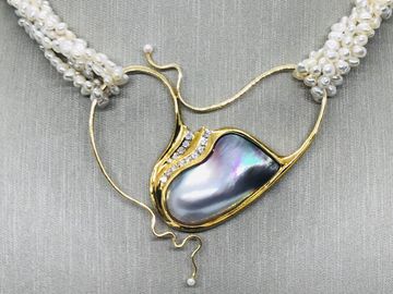 18k Yellow Gold Pearl, Abalone & Diamond necklace
