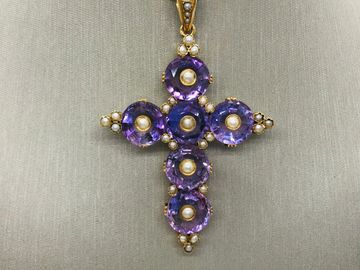 18k Yellow Gold Amethyst & Seed Pearl Cross