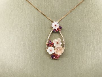14k Pink Gold Pendant With Mother Of Pearl Flowers, Amethyst, Diamonds & Morganite
