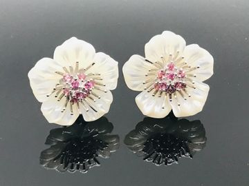 18k White Gold Mother Of Pearl Flower Earrings With Pink Sapphire Detail