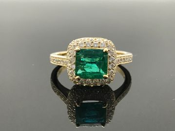 18k Yellow Gold Emerald & Diamond Ring with Diamond Halo